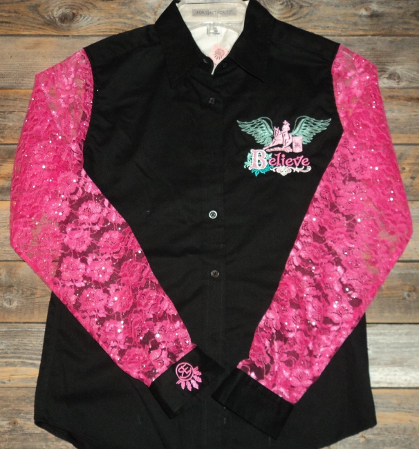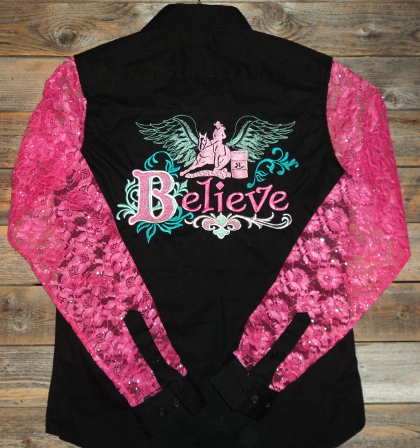 Small black rodeo shirt with sparkly pink lace sleeves, Believe barrel racer design and Bling