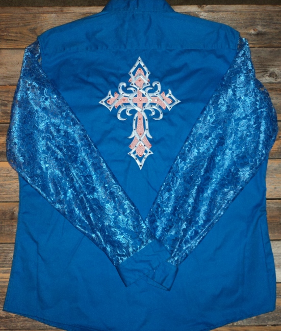 Large strong blue with blue lace sleeves, tribal cross design and BLING