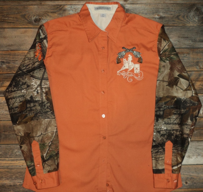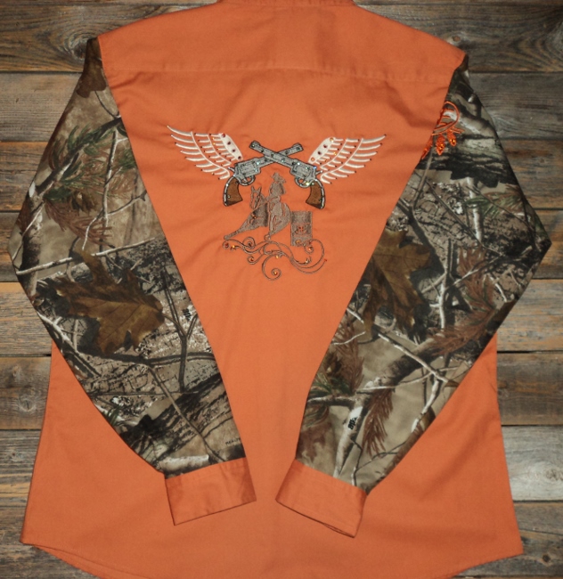 Large burnt orange rodeo shirt with real tree camo sleeves, pistol wings barrel racer design and BLING