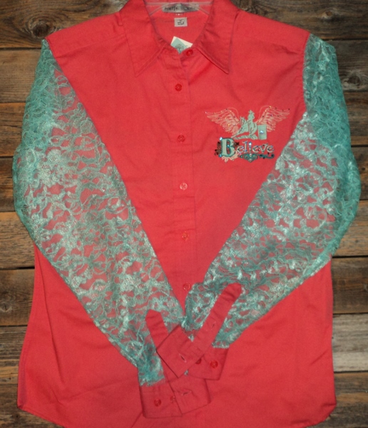 Medium hibiscus rodeo shirt with aqua lace sleeves, believe barrel racer design with bling