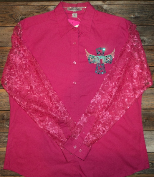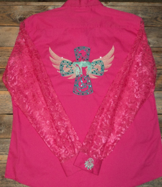 tropical pink rodeo shirt with pink lace sleeves, praying cowgirl cross with wings design and bling
