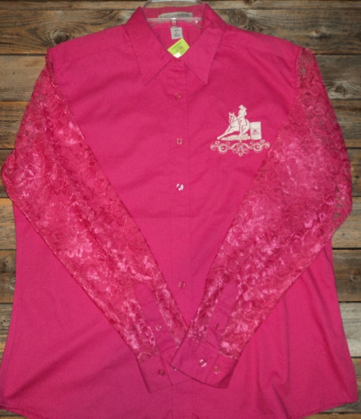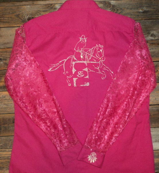 tropical pink rodeo shirt with pink lace sleeves, barrel racer sketch design and bling