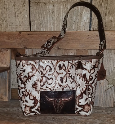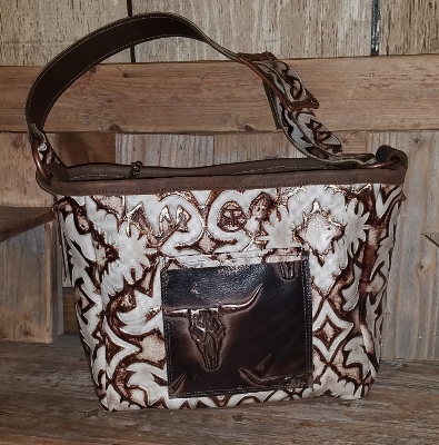 Handmade Leather Purse, 12x10x5. Lined with upholstery vinyl for easy cleaning. 1 inside and 2 outside pockets. Adjustable strap, zipper closure and horse hair zipper pull. Cow tag key chain, can be left on purse , or used as key chain.