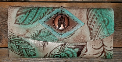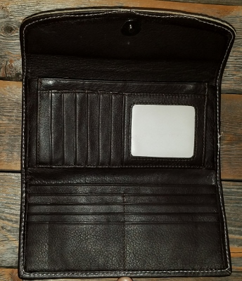 Tri fold wallet/clutch with magnetic clasp. Calfskin interior.